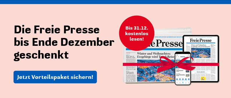 Ich möchte die Freie Presse bis zum 31.12.2025 kostenlos und anschließend für mindestens sechs Monate zum Vorteilspreis von monatlich 57,99 € lesen. Das Abonnement berechtigt Sie auch zur Nutzung der Freie Presse App inklusive der digitalen Zeitung und von freiepresse.de einschließlich aller FP+ Artikel und kann erstmals mit einer Frist von 1 Monat zum Ablauf der Mindestbezugsdauer und danach jederzeit monatlich in Textform gekündigt werden. Die Gewinner der Verlosung werden per E-Mail benachrichtigt. Teilnahme ab 18 Jahre, der Rechtsweg ist ausgeschlossen.