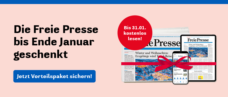 Ich möchte die Freie Presse bis zum 31.1.2026 kostenlos und anschließend für mindestens sechs Monate zum Vorteilspreis von monatlich 57,99 € lesen. Das Abonnement berechtigt Sie auch zur Nutzung der Freie Presse App inklusive der digitalen Zeitung und von freiepresse.de einschließlich aller FP+ Artikel und kann erstmals mit einer Frist von 1 Monat zum Ablauf der Mindestbezugsdauer und danach jederzeit monatlich in Textform gekündigt werden. Die Gewinner der Verlosung werden per E-Mail benachrichtigt. Teilnahme ab 18 Jahre, der Rechtsweg ist ausgeschlossen.