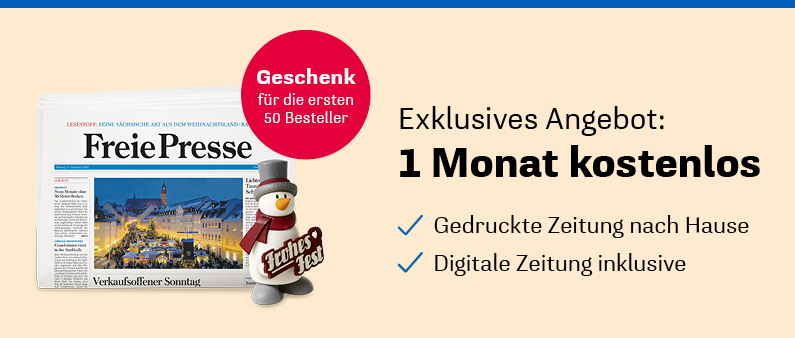 Ich lese die Freie Presse 1 Monat kostenlos. Wenn mir die Freie Presse gefällt, brauche ich nichts weiter zu tun und lese nach dem kostenlosen Zeitraum weitere 3 Monate zum exklusiven Sonderpreis von nur 19,99 €/Monat (Ersparnis 114 €). Danach gilt der jeweils gültige Vorteilspreis (derzeit 57,99 €/Monat). Ich kann jederzeit, erstmals zum Ende des kostenlosen Probezeitraumes und danach jeweils zum Monatsende, kündigen. Das Angebot berechtigt Sie auch zur Nutzung der Freie Presse App inklusive E-Paper und von freiepresse.de einschließlich aller FP+ Artikel. Das Angebot gilt nur für Haushalte im Verbreitungsgebiet der Freien Presse, die in den letzten 12 Monaten keine gedruckte Zeitung bezogen haben.