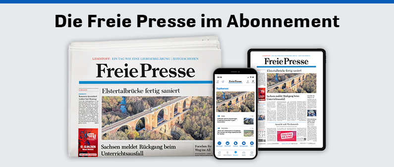 Sie lesen die Freie Presse zum jeweils gültigen Vorteilspreis (derzeit monatlich 57,99 € | außerhalb des Verbreitungsgebietes der Freien Presse zzt. 75,99 €/Monat). Das Abonnement berechtigt Sie auch zur Nutzung der Freie Presse App inklusive digitaler Zeitung und von freiepresse.de einschließlich aller FP+ Artikel und kann jederzeit monatlich in Textform gekündigt werden.