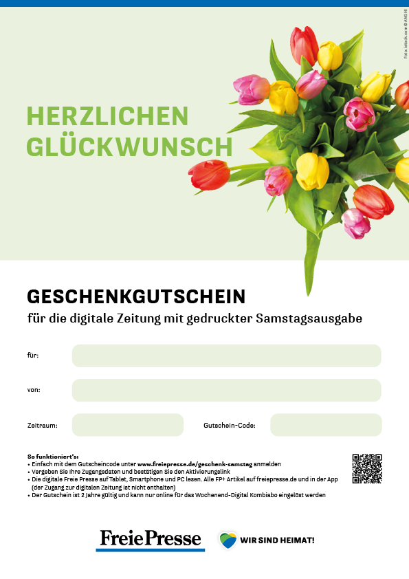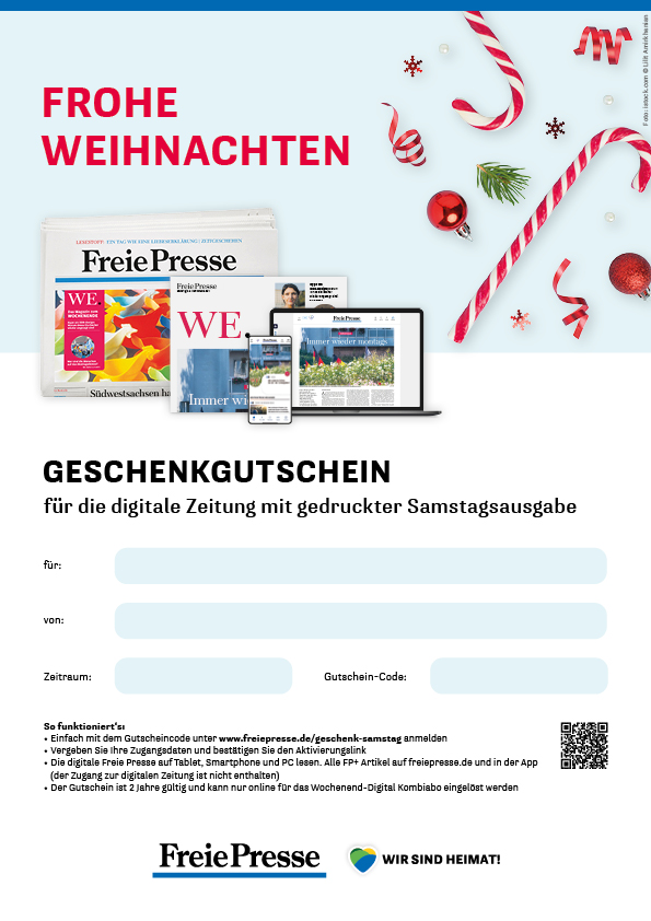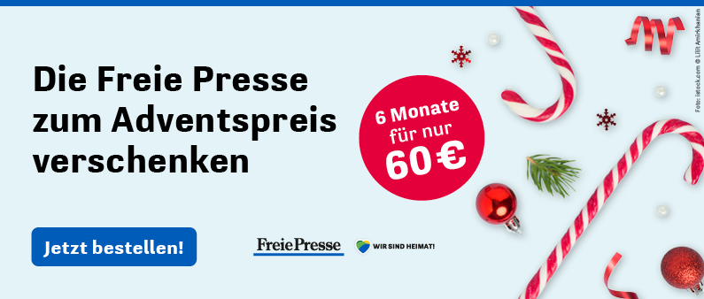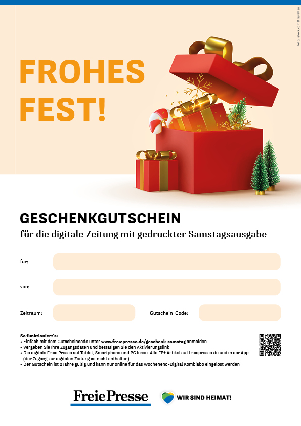 Ich verschenke die Freie Presse für 12 Monate für einmalig 120,00 €. Enthalten sind der Zugriff auf alle FP+ Artikel auf freiepresse.de und in der App (der Zugang zur digitalen Zeitung ist nicht enthalten) sowie die gedruckte Samstagausgabe, die einmal pro Woche bequem nach Hause geliefert wird.